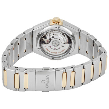 Stainless steel case with a stainless steel bracelet with 18kt yellow gold links. Fixed 18kt yellow gold bezel. Silver dial with luminous gold-tone alpha-style skeleton hands and index hour markers. Minute markers around the outer rim. Dial Type: Analog. Date display at the 6 o'clock position. Omega calibre 8700 automatic movement with a 50-hour power reserve. Scratch resistant sapphire crystal. Transparent case back. Round case shape. Case size: 29 mm. Band width: 17.6 mm. Push button fold over clasp. Water resistant at 50 meters / 165 feet. Functions: date, hour, minute, second,co-axial escapement,chronometer. Luxury watch style. Watch label: Swiss Made. Omega Constellation Manhattan Automatic Chronometer Silver Dial Ladies Watch 131.20.29.20.02.002.