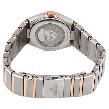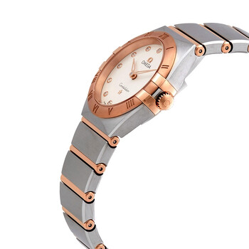 Stainless steel case with a stainless steel bracelet with 18kt sedna gold bars. Fixed 18kt sedna gold bezel. White silvery dial with rose gold-tone skeleton hands and diamond hour markers. Dial Type: Analog. Omega calibre 4061 quartz movement. Scratch resistant sapphire crystal. Push / pull crown. Solid case back. Round case shape. Case size: 28 mm. Band width: 17.5 mm. Push button fold over clasp. Water resistant at 30 meters / 100 feet. Functions: hour, minute. Luxury watch style. Watch label: Swiss Made. Omega Constellation Manhattan Diamond Dial Ladies Steel and 18k Sedna Gold Watch 131.20.28.60.52.001.