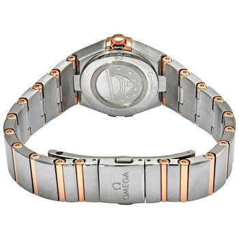 Stainless steel case with a stainless steel bracelet with 18kt sedna gold bars. Fixed 18kt sedna gold bezel set with diamonds. Silver dial with rose gold-tone skeleton hands and diamond hour markers. Dial Type: Analog. Omega calibre 4061 quartz movement. Scratch resistant sapphire crystal. Pull / push crown. Solid case back. Round case shape. Case size: 25 mm. Band width: 15.9 mm. Fold over clasp with a push button release. Water resistant at 30 meters / 100 feet. Functions: hour, minute. Dress watch style. Watch label: Swiss Made. Omega Constellation Manhattan Diamond Silver Dial Ladies Watch 131.25.25.60.52.001.