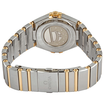 Stainless steel case with a stainless steel bracelet with 18kt yellow gold bars. Fixed 18kt yellow gold bezel. Yellow gold dial with gold-tone hands and diamond hour markers. Dial Type: Analog. Omega calibre 4061 quartz movement. Scratch resistant sapphire crystal. Pull / push crown. Solid case back. Round case shape. Case size: 28 mm. Band width: 17.5 mm. Fold over clasp with a push button release. Water resistant at 30 meters / 100 feet. Functions: hour, minute. Constellation Manhattan Series. Luxury watch style. Watch label: Swiss Made. Omega Constellation Manhattan Quartz Diamond Ladies Watch 131.20.28.60.58.001.