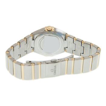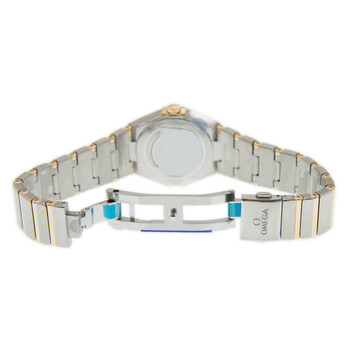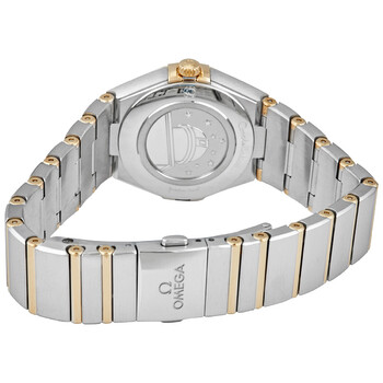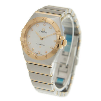 Gold-tone stainless steel case with a two-tone stainless steel with 18kt yellow gold bracelet. Fixed 18kt yellow gold bezel. White mother of pearl dial with gold-tone hands and diamond hour markers. Dial Type: Analog. Omega Calibre 4061 quartz movement. Scratch resistant sapphire crystal. Screw down crown. Solid case back. Round case shape. Case size: 28 mm. Band width: 17.5 mm. Butterfly clasp. Water resistant at 30 meters / 100 feet. Functions: hour, minute. Luxury watch style. Watch label: Swiss Made. Omega Constellation Manhattan Quartz Diamond White Mother of Pearl Dial Ladies Watch 131.20.28.60.55.002.