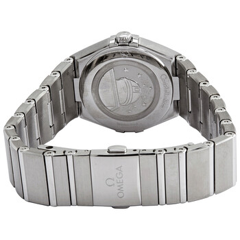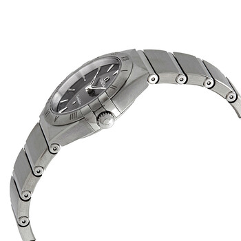 Stainless steel case with a stainless steel bracelet. Fixed stainless steel bezel. Grey dial with 18kt white gold hands and 18kt white gold index hour markers. Dial Type: Analog. Omega calibre 4061 quartz movement. Scratch resistant sapphire crystal. Pull / push crown. Solid case back. Round case shape. Case size: 28 mm. Band width: 17.5 mm. Fold over clasp with a push button release. Water resistant at 30 meters / 100 feet. Functions: hour, minute. Luxury watch style. Watch label: Swiss Made. Omega Constellation Manhattan Quartz Grey Dial Ladies Watch 131.10.28.60.06.001.