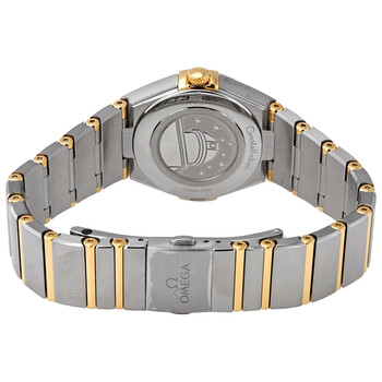 Stainless steel case with a stainless steel bracelet with 18kt yellow gold bars. Fixed 18kt yellow gold bezel. White silvery dial with gold-tone hands and index hour markers. Dial Type: Analog. Omega calibre 4061 quartz movement. Scratch resistant sapphire crystal. Push / pull crown. Solid case back. Round case shape. Case size: 28 mm. Case thickness: 9 mm. Band width: 17.5 mm. Fold over clasp with a push button release. Water resistant at 30 meters / 100 feet. Functions: hour, minute. Luxury watch style. Watch label: Swiss Made. Omega Constellation Manhattan Steel and 18kt Yellow Gold Ladies Watch 131.20.28.60.02.002.
