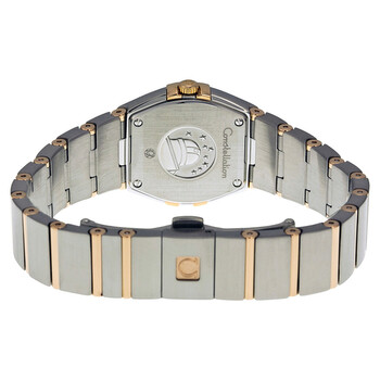 Stainless steel case with a stainless steel bracelet with 18kt rose gold bars. Fixed 18kt rose gold bezel set with 28 diamonds. Mother of pearl dial with luminous rose gold hands. Dial Type: Analog. Luminescent hands. Quartz movement. Scratch resistant sapphire crystal. Pull / push crown. Solid case back. Case diameter: 24 mm. Case thickness: 18.2 mm. Round case shape. Band width: 19.05 mm. Band length: 7.5 inches. Fold over clasp with push button release. Water resistant at 100 meters / 330 feet. Functions: hour, minute. Luxury watch style. Watch label: Swiss Made. Omega Constellation Mother of Pearl Steel and Rose Gold Diamond Ladies Watch 12325246005002.