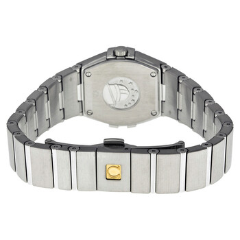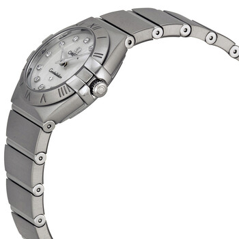 Stainless steel case with a stainless steel bracelet. Fixed stainless steel bezel. Mother of pearl dial with silver-tone hands and diamond hour markers. Dial Type: Analog. Quartz movement. Scratch resistant sapphire crystal. Pull / push crown. Solid case back. Case diameter: 24 mm. Case thickness: 8.2 mm. Round case shape. Band width: 19.1 mm. Band length: 7.5 inches. Push button fold over clasp. Water resistant at 100 meters/ 330 feet. Functions: hours, minutes. Dress watch style. Watch label: Swiss Made. Omega Constellation Mother of Pearl Dial 24 mm Ladies Watch 123.10.24.60.55.001.