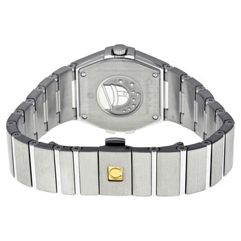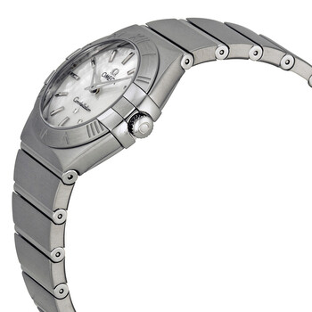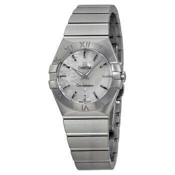 Stainless steel case with a brushed stainless steel bracelet. Fixed stainless steel bezel. Mother of pearl dial with silver-tone hands and index hour markers. Dial Type: Analog. Quartz movement. Scratch resistant sapphire crystal. Pull / push crown. Solid case back. Case diameter: 27 mm. Case thickness: 9 mm. Round case shape. Bracelet width: 18 mm. Fold over clasp with a safety release. Water resistant at 100 meters / 330 feet. Functions: hour, minute. Luxury watch style. Watch label: Swiss Made. Omega Constellation Mother of Pearl Dial Stainless Steel Ladies Watch 123.10.27.60.05.001.