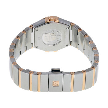 Stainless steel case with a stainless steel bracelet with 18kt rose gold bars. Fixed 18kt rose gold bezel. Mother of pearl dial with luminous rose gold hands and index hour markers. Dial Type: Analog. Quartz movement. Scratch resistant sapphire crystal. Pull / push crown. Solid case back. Case diameter: 27 mm. Case thickness: 9 mm. Round case shape. Band width: 19.05 mm. Band length: 7.5 inches. Fold over clasp with a push button release. Water resistant at 100 meters / 330 feet. Functions: hour, minute. Luxury watch style. Watch label: Swiss Made. Item Variations: 123 20 27 60 05 003, 123-20-27-60-05-003, 123/20/27/60/05/003, 12320276005003. Omega Constellation Mother of Pearl Dial Steel and 18kt Rose Gold Ladies Watch 123.20.27.60.05.003.