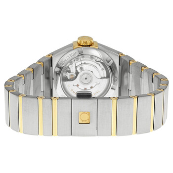 Silver-tone stainless steel case with a two-tone (silver-tone and yellow gold-tone) stainless steel and 18kt yellow gold bracelet. Fixed 18kt yellow gold set with diamonds bezel. White mother of pearl dial with gold-tone dauphine-style shape hands and diamond hour markers. Dial Type: Analog. Luminescent hands. Date display at the 3 o'clock position. Omega Calibre 8520 Automatic movement, based upon Omega 8500, containing 28 Jewels, bitting at 25200 vph, and has a power reserve of approximately 50 hours. Scratch resistant sapphire crystal. Pull / push crown. Transparent case back. Round case shape, case size: 27 mm, case thickness: 9 mm. Band width: 19 mm, band length: 7.5 inches. Deployment clasp. Water resistant at 100 meters / 330 feet. Functions: date, hour, minute, second, chronometer. Luxury watch style. Watch label: Swiss Made. Item Variations: 123 25 27 20 55 003, 123-25-27-20-55-003, 123/25/27/20/55/003, 12325272055003. Omega Constellation Mother of Pearl Dial Ladies Watch 12325272055003.