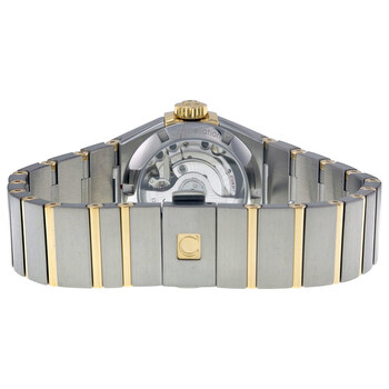 Stainless steel and 18kt yellow gold case with a stainless steel and 18kt yellow gold bracelet. Fixed bezel. Mother of pearl dial with gold-toned hands and diamond hour markers. Dial Type: Analog. Date display at the 3 o'clock position. Omega Calibre 8520 automatic movement with about 50 hours of power reserve. Scratch resistant sapphire crystal. Screw down crown. Case size: 27 mm. Round case shape. Deployment clasp. Water resistant at 100 meters / 330 feet. Functions: hour, minute, second. Luxury watch style. Watch label: Swiss Made. Omega Constellation Mother of Pearl Dial Steel and 18kt Yellow Gold Ladies Watch 123.25.27.20.55.004.