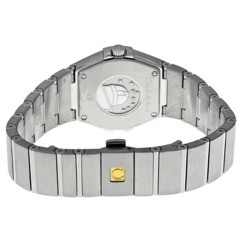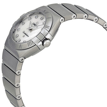 Silver-tone stainless steel case with a silver-tone stainless steel bracelet. Fixed roman numeral silver-tone stainless steel bezel. Mother of pearl dial with silver-tone dauphine-style shape hands and diamond hour markers. Dial Type: Analog. Luminescent hands. Omega Calibre 1376 quartz movement with a 48 months power reserve. Scratch resistant anti-reflective sapphire crystal. Screw down crown. Solid case back. Round case shape, case size: 27 mm, case thickness: 9 mm. Band width: 15 mm, band length: 7 inches. Fold over push button release clasp. Water resistant at 100 meters / 330 feet. Functions: hour, minute. Luxury watch style. Watch label: Swiss Made. Item Variations: 123 10 27 60 55 001, 123-10-27-60-55-001, 123/10/27/60/55/001, 12310276055001. Omega Constellation Mother of Pearl Diamond Dial Ladies Watch 123.10.27.60.55.001.