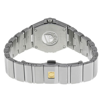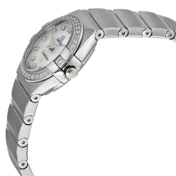 Silver-tone stainless steel case and bracelet. Fixed silver-tone bezel set with diamonds. Mother of pearl dial with silver-tone hands and diamond hour markers. Dial Type: Analog. Luminescent hands. Omega Calibre 1376 quartz movement. Scratch resistant sapphire crystal. Pull / push crown. Solid case back. Case size: 24 mm. Round case shape. Band width: 16 mm. Deployment clasp with a push button release. Water resistant at 100 meters / 330 feet. Functions: hour, minute. Luxury watch style. Watch label: Swiss Made. Item Variations: 12315246055003. Omega Constellation Mother of Pearl Diamond Dial Ladies Watch 123.15.24.60.55.003.