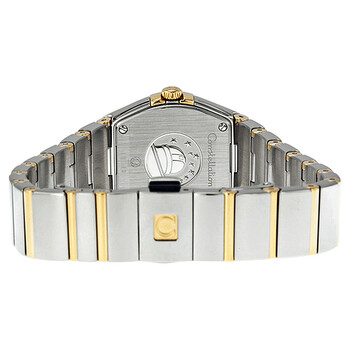 Stainless steel and yellow gold case with a stainless steel and yellow gold bracelet. Fixed engraved with roman numeral bezel. White mother-of-pearl dial with gold-tone hands and diamonds hour markers. Dial Type: Analog. Luminescent hands. Quartz movement. Scratch resistant sapphire crystal. Solid case back. Case diameter: 24 mm. Case thickness: 7.5 mm. Band width: 15 mm. Fold over with safety clasp. Water resistant at 100 meters / 330 feet. Functions: hour, minute. Luxury watch style. Watch label: Swiss Made. Omega Constellation Polished Quartz White Mother-of-Pearl Ladies Watch 12320246055004.