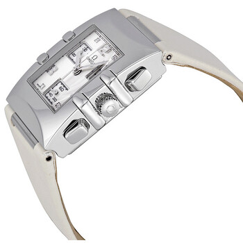 Stainless steel case with a white fabric strap. Fixed stainless steel bezel. White dial with silver-tone hands and diamond hour markers. Arabic numerals mark the 4, 8 and 12 o'clock positions. Minute markers around the outer rim. Dial Type: Analog. Luminescent hands. Chronograph - three square sub-dials displaying: 30 minutes, 60 seconds, 1/10th seconds sub dials. Quartz movement. Scratch resistant sapphire crystal. Solid case back. Case dimensions: 34 mm x 28 mm. Case thickness: 10 mm. Square case shape. Band width: 28 mm. Push button deployment clasp. Water resistant at 30 meters/ 100 feet. Functions: hours, minutes, seconds, date, chronograph. Luxury watch style. Watch label: Swiss Made. Omega Constellation Quadra Ladies Watch 1841.35.71.