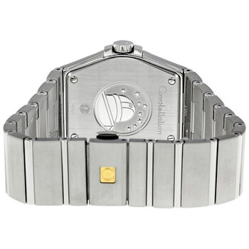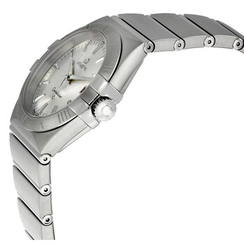 Stainless steel case with a brushed stainless steel bracelet. Fixed stainless steel bezel engraved with Roman numeral hour markers. Silver dial with luminous hands and index hour markers. Minute markers around the outer rim. Dial Type: Analog. Luminescent hands and markers. Date displays at the 3 o'clock position. Quartz movement. Scratch resistant anti-reflective sapphire crystal. Pull / push crown. Solid case back. Case diameter: 35 mm. Case thickness: 9 mm. Round case shape. Band width: 23 mm. Push button fold over clasp. Water resistant at 100 meters/330 feet. Functions: hours, minutes, seconds, date. Additional Info: end of battery life indicator. Luxury watch style. Watch label: Swiss Made. Omega Constellation Quartz 35mm Men's Watch 123.10.35.60.02.001.