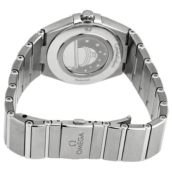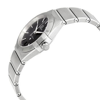Stainless steel case and bracelet. Fixed stainless steel bezel. Black dial with 18kt white gold hands and index hour markers. Dial Type: Analog. Date display at the 6 o'clock position. Omega Calibre quartz movement. Scratch resistant sapphire crystal. Pull / push crown. Solid case back. Round case shape. Case size: 36 mm. Band width: 22.9 mm. Push button folding clasp. Water resistant at 30 meters / 100 feet. Functions: date, hour, minute, second. Constellation Quartz Series. Luxury watch style. Watch label: Swiss Made. Omega Constellation Quartz Black Dial Ladies Watch 13110366001001.