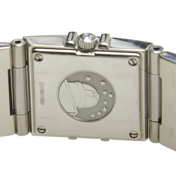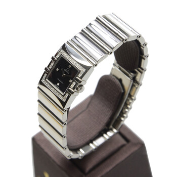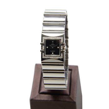 Silver-tone stainless steel case and bracelet. Fixed silver-tone bezel with diamond set. Black dial with silver-tone hands and diamond hour markers. Dial Type: Analog. Omega Calibre 1376 quartz movement. Scratch resistant sapphire crystal. Solid case back. Rectangle case shape, case size: 19 mm. Water resistant at 30 meters / 100 feet. Functions: hour, minute. Additional Info: original box, international warranty card, manual (complete accessories). Constellation Series. Luxury watch style. Watch label: Swiss Made. Omega Constellation Quartz Diamond Black Dial Unisex Watch 15284600.