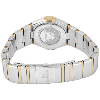 Stainless steel case with a stainless steel bracelet with 18kt yellow gold bars. Fixed 18kt yellow gold bezel. Blue dial with yellow gold-tone skeleton hands and diamond hour markers. Dial Type: Analog. Omega calibre 4061 quartz movement. Scratch resistant sapphire crystal. Solid case back. Round case shape. Case size: 25 mm. Band width: 15.9 mm. Fold over clasp with a push button release. Water resistant at 30 meters / 100 feet. Functions: hour, minute. Constellation Series. Dress watch style. Watch label: Swiss Made. Omega Constellation Quartz Diamond Blue Dial Ladies Watch 131.20.25.60.53.001.