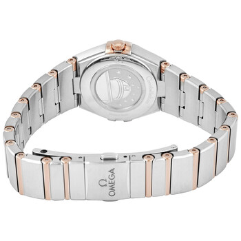 Stainless steel case with a stainless steel bracelet with 18kt sedna gold bars. Fixed 18kt sedna gold bezel. Blue (aventurine) dial with rose gold-tone skeleton hands and diamond hour markers. Dial Type: Analog. Omega calibre 4061 quartz movement. Scratch resistant sapphire crystal. Solid case back. Round case shape. Case size: 25 mm. Band width: 15.9 mm. Push button fold over clasp. Water resistant at 30 meters / 100 feet. Functions: hour, minute. Dress watch style. Watch label: Swiss Made. Omega Constellation Quartz Diamond Blue Dial Ladies Watch 131.20.25.60.53.002.