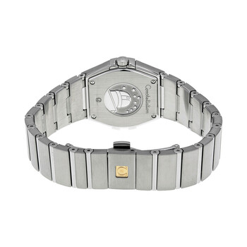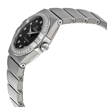 Stainless steel case with a stainless steel bracelet. Fixed stainless steel bezel set with 28 diamonds. Black guilloche dial with silver-tone hands and diamond hour markers. Dial Type: Analog. Luminescent hands. Omega calibre 1376 quartz movement with a 48 months power reserve. Scratch resistant sapphire crystal. Pull / push crown. Solid case back. Round case shape. Case size: 27 mm. Case thickness: 9 mm. Band width: 15 mm. Band length: 7 inches. Fold over clasp with a push button release. Water resistant at 100 meters / 330 feet. Functions: hour, minute. Luxury watch style. Watch label: Swiss Made. Item Variations: 123 15 27 60 51 001, 123-15-27-60-51-001, 123/15/27/60/51/001, 12315276051001. Omega Constellation Quartz Diamond Ladies Watch 123.15.27.60.51.001.