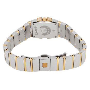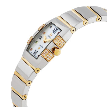 Silver-tone stainless steel case with a two-tone (silver-tone and gold-tone) stainless steel bracelet. Fixed silver-tone stainless steel bezel. White dial with gold-tone hands and index-Roman numeral hour markers. Dial Type: Analog. Omega Calibre 1376 quartz movement. Scratch resistant sapphire crystal. Pull / push crown. Solid case back. Tonneau case shape, case size: 25.3 x 19.3 mm. Water resistant at 30 meters / 100 feet. Functions: hour, minute. Constellation Series. Luxury watch style. Watch label: Swiss Made. Omega Constellation Quartz White Dial Ladies Watch 1284.79.00.