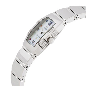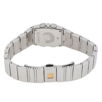 Silver-tone stainless steel case with a stainless steel bracelet. Fixed silver-tone stainless steel bezel. White dial with silver-tone hands and index-Arabic numeral hour markers. Dial Type: Analog. Omega Calibre 1376 quartz movement. Scratch resistant sapphire crystal. Pull / push crown. Solid case back. Tonneau case shape, case size: 25.3 x 19.3 mm. Band width: 16 mm. Butterfly clasp. Water resistant at 30 meters / 100 feet. Functions: hour, minute. Constellation Series. Luxury watch style. Watch label: Swiss Made. Omega Constellation Quartz White Dial Ladies Watch 1585.79.00.