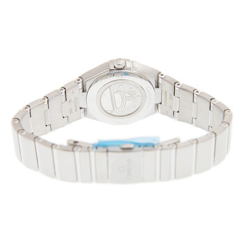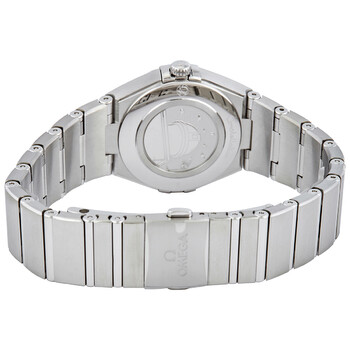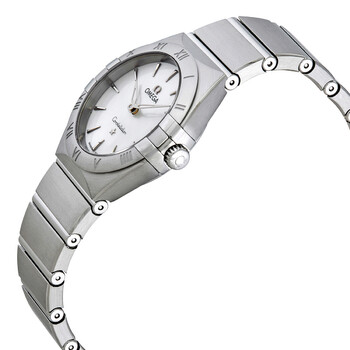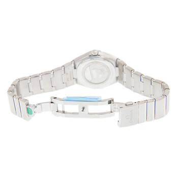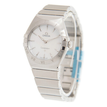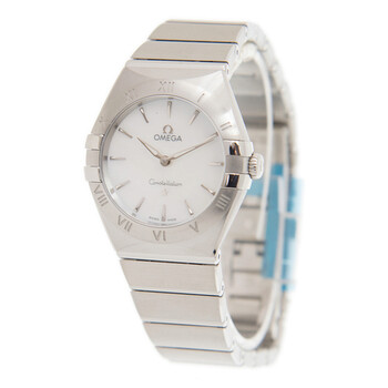 Stainless steel case with a stainless steel bracelet. Fixed stainless steel bezel. White mother of pearl dial with silver-tone skeleton hands and index hour markers. Dial Type: Analog. Omega calibre 4061 quartz movement. Scratch resistant sapphire crystal. Solid case back. Round case shape. Case size: 28 mm. Band width: 17.5 mm. Push button fold over clasp. Water resistant at 30 meters / 100 feet. Functions: hour, minute. Additional Info: original box, manual (complete accessories). Luxury watch style. Watch label: Swiss Made. Omega Constellation Quartz White Mother of Pearl Dial Ladies Watch 131.10.28.60.05.001.