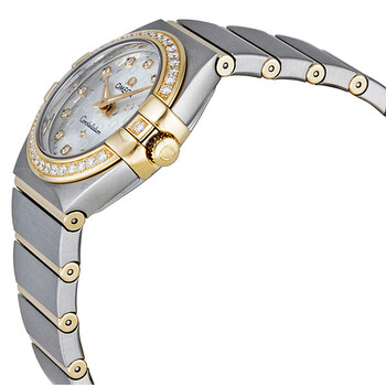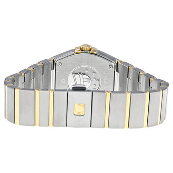 Brushed solid 18kt gold with steel case with a brushed solid 18kt gold with steel bracelet. Fixed diamonds set on bezel bezel. Silver diamond dial with gold-tone hands and diamonds hour markers. Dial Type: Analog. Luminescent hands and markers. Quartz movement. Scratch resistant sapphire crystal. Screw down crown. Case diameter: 27 mm. Round case shape. Hidden double push button deployment clasp. Water resistant at 100 meters / 330 feet. Functions: hour, minute. Casual watch style. Watch label: Swiss Made. Omega Constellation Silver Diamond Brushed Solid 18kt Gold with Steel Ladies Watch 123.25.27.60.52.002.