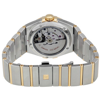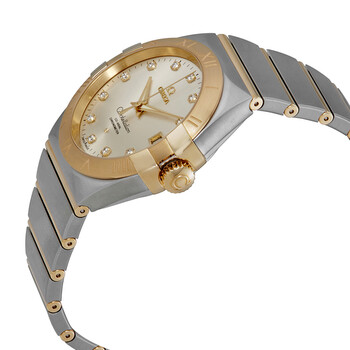Silver-tone stainless steel case with a two-tone (silver-tone and rose gold-tone) stainless steel with 18kt yellow gold bars bracelet. Fixed roman numeral 18kt yellow gold bezel. Silver dial with gold-tone dauphine-style shape hands and diamond hour markers. Minute markers around the outer rim. Dial Type: Analog. Luminescent hands. Date display at the 3 o'clock position. Omega Calibre 8500 Automatic movement, containing 39 Jewels, composed of 202 parts, bitting at 25200 vph, and has a power reserve of approximately 60 hours. Scratch resistant sapphire crystal. Pull / push crown. Transparent case back. Round case shape, case size: 38 mm. Band width: 25 mm. Fold over with push button release clasp. Water resistant at 100 meters / 330 feet. Functions: date, hour, minute, second, co-axial escapement, chronometer. Constellation Series. Luxury watch style. Watch label: Swiss Made. Omega Constellation Silver Diamond Dial Men's Watch 123.20.38.21.52.002.