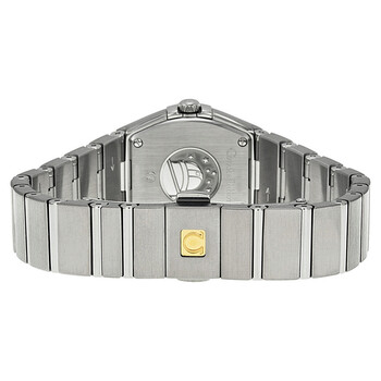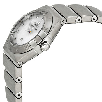 Stainless steel case with a stainless steel bracelet. Fixed stainless steel bezel showing Roman numeral markers. White mother of pearl dial with luminous silver-tone hands and diamond hour markers. Dial Type: Analog. Luminescent hands. Quartz movement. Scratch resistant, anti-reflective sapphire crystal. Push / pull crown. Solid case back. Case diameter: 24 mm. Case thickness: 9 mm. Round case shape. Band width: 15 mm. Deployment clasp. Water resistant at 100 meters / 330 feet. Functions: hour, minute. Luxury watch style. Watch label: Swiss Made. Omega Constellation White Mother of Pearl Dial Stainless Steel Ladies Watch 12310246055003.