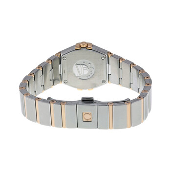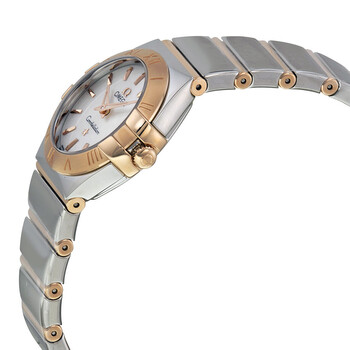Stainless steel case with a stainless steel bracelet with 18kt rose gold bars. Fixed 18kt rose gold bezel. White mother of pearl dial with rose gold hands and index hour markers. Dial Type: Analog. Quartz movement. Scratch resistant sapphire crystal. Pull / push crown. Solid case back. Case diameter: 24 mm. Case thickness: 8.2 mm. Round case shape. Band width: 19.05 mm. Band length: 7.5 inches. Butterfly clasp. Water resistant at 100 meters / 330 feet. Functions: hour, minute. Dress watch style. Omega Constellation White Mother of Pearl Dial Stainless Steel and 18kt Rose Gold Ladies Watch 12320246005003.