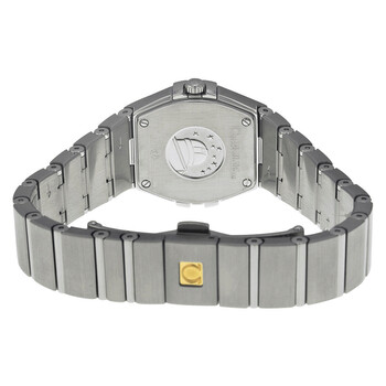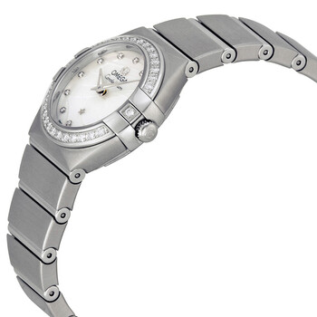 Stainless steel case with a stainless steel bracelet. Fixed stainless steel set with diamonds bezel. White mother of pearl (wavy pattern) dial with luminous silver-tone dauphine-style hands and diamond hour markers. Dial Type: Analog. Luminescent hands. Omega calibre 1376 quartz movement with a 48 months battery life. Scratch resistant sapphire crystal. Pull / push crown. Solid case back. Round case shape. Case size: 24 mm. Case thickness: 8.2 mm. Band width: 16 mm. Band length: 7 inches. Butterfly clasp. Water resistant at 100 meters / 330 feet. Functions: hour, minute. Constellation Series. Dress watch style. Watch label: Swiss Made. Item Variations: 12315246055006. Omega Constellation White Mother of Pearl Dial Stainless Steel Ladies Watch 123.15.24.60.55.006.