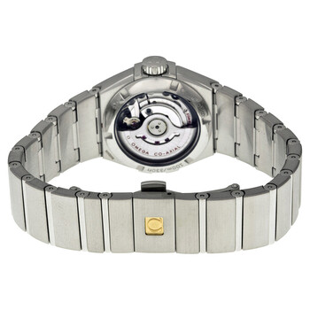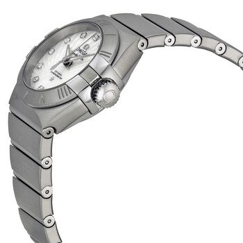 Stainless steel case with a stainless steel bracelet. Fixed stainless steel bezel. White mother of pearl dial with luminous silver-tone hands and diamond hour markers. Dial Type: Analog. Luminescent hands. Date display at the 3 o'clock position. Automatic movement with a 50 hour power reserve. Scratch resistant sapphire crystal. Pull / push crown. Skeleton case back. Case diameter: 27 mm. Round case shape. Fold over clasp with a safety release. Water resistant at 100 meters / 330 feet. Functions: date, hour, minute, second. Luxury watch style. Watch label: Swiss Made. Omega Constellation White Mother of Pearl Steel Ladies Watch 123.10.27.20.55.001.