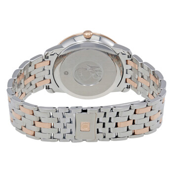 Stainless steel case with a stainless steel bracelet with 18kt rose gold links. Fixed 18kt rose gold bezel. Brown dial with rose gold-tone dauphine-style hands and alternating Roman numeral and dot hour markers. Minute markers around the outer rim. Dial Type: Analog. Date display at the 3 o'clock position. Omega calibre 2500 automatic movement, based upon ETA 2892-A2, containing 27 Jewels, bitting at 25200 vph, and has a power reserve of approximately 48 hours. Scratch resistant sapphire crystal. Pull / push crown. Solid case back. Round case shape. Case size: 36.8 mm. Case thickness: 7 mm. Band width: 19 mm. Fold over clasp. Water resistant at 30 meters / 100 feet. Functions: date, hour, minute, second, co-axial escapement, chronometer. De Ville Series. Luxury watch style. Watch label: Swiss Made. Omega De Ville Automatic Brown Dial Watch 424.20.37.20.13.001.