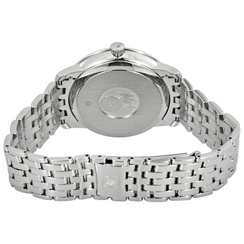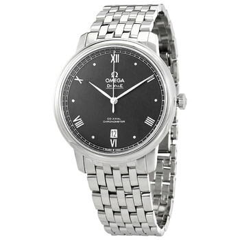 Stainless steel case with a stainless steel bracelet. Fixed stainless steel bezel. Black dial with silver-tone hands and alternating Roman numeral and dot hour markers. Minute markers around the outer rim. Dial Type: Analog. Date display at the 6 o'clock position. Omega calibre 2500 automatic movement, based upon ETA 2892-A2, containing 27 Jewels, bitting at 25200 vph, and has a power reserve of approximately 48 hours. Scratch resistant sapphire crystal. Solid case back. Round case shape. Case size: 39 mm. Band width: 20 mm. Fold over clasp with a push button release. Water resistant at 30 meters / 100 feet. Functions: date, hour, minute, second, co-axial escapement, chronometer. Additional Info: original box, manual (complete accessories). De Ville Series. Luxury watch style. Watch label: Swiss Made. Omega De Ville Automatic Chronometer Black Dial Men's Watch 424.10.40.20.01.003.