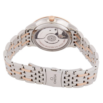 Silver-tone stainless steel case with a two-tone (silver-tone and rose gold-tone) stainless steel and 18kt rose gold bracelet. Fixed rose gold-tone 18kt rose gold bezel. Blue dial with rose gold-tone hands and Roman numeral hour markers. Minute markers around the outer rim. Dial Type: Analog. Date display at the 6 o'clock position. Omega Calibre 8800 Automatic movement, containing 35 Jewels, bitting at 25200 vph, and has a power reserve of approximately 55 hours. Scratch resistant sapphire crystal. Transparent see through case back. Round case shape, case size: 34 mm. Fold over clasp with a safety release. Water resistant at 30 meters / 100 feet. Functions: date, hour, minute, second, co-axial escapement, chronometer, magnetic resistant. Additional Info: original box, international warranty card, manual (complete accessories). De Ville Series. Luxury watch style. Watch label: Swiss Made. Omega De Ville Automatic Chronometer Blue Dial Ladies Watch 434.20.34.20.03.001.