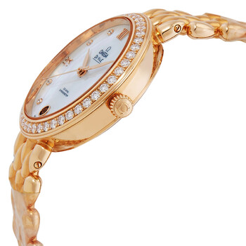 18kt rose gold case with a polished 18kt rose gold bracelet. Fixed 18kt rose gold bezel with diamond set. Mother of pearl dial with rose gold-tone hands and Roman numeral hour markers. Dial Type: Analog. Date display at the 6 o'clock position. Omega Calibre 2500 Automatic movement, based upon ETA 2892-A2, containing 27 Jewels, bitting at 25200 vph, and has a power reserve of approximately 48 hours. Scratch resistant sapphire crystal. Pull / push crown. Solid case back. Round case shape, case size: 32.7 mm, case thickness: 9.5 mm. Push button folding clasp. Water resistant at 30 meters / 100 feet. Functions: date, hour, minute, second, co-axial escapement, chronometer. De Ville Automatic Series. Luxury watch style. Watch label: Swiss Made. Omega De Ville Automatic Chronometer Diamond Ladies Watch 424.55.33.20.55.007.