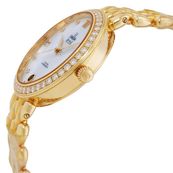 18kt yellow gold case with a polished 18kt yellow gold bracelet. Fixed 18kt yellow gold bezel with diamond set. Mother of pearl dial with gold-tone hands and diamond hour markers. Dial Type: Analog. Date display at the 6 o'clock position. Omega Calibre 2500 Automatic movement, based upon ETA 2892-A2, containing 27 Jewels, bitting at 25200 vph, and has a power reserve of approximately 48 hours. Scratch resistant sapphire crystal. Pull / push crown. Solid case back. Round case shape, case size: 32.7 mm, case thickness: 9.5 mm. Push button folding clasp. Water resistant at 30 meters / 100 feet. Functions: date, hour, minute, second, co-axial escapement, chronometer. De Ville Series. Dress watch style. Watch label: Swiss Made. Omega De Ville Automatic Chronometer Diamond Ladies Watch 424.55.33.20.55.009.