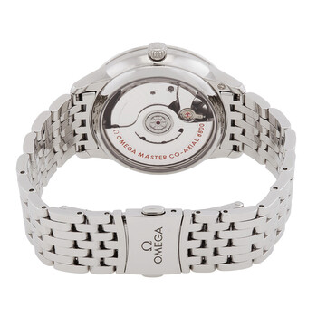 Silver-tone stainless steel case and bracelet. Fixed silver-tone stainless steel bezel. Green dial with yellow gold-tone hands and Roman numeral hour markers. Minute markers around the outer rim. Dial Type: Analog. Date display at the 6 o'clock position. Omega Calibre 8800 Automatic movement, containing 35 Jewels, bitting at 25200 vph, and has a power reserve of approximately 55 hours. Scratch resistant sapphire crystal. Transparent see through case back. Round case shape, case size: 34 mm. Fold over clasp with a safety release. Water resistant at 30 meters / 100 feet. Functions: date, hour, minute, second, co-axial escapement, chronometer, magnetic resistant. Additional Info: original box, international warranty card, manual (complete accessories). De Ville Series. Luxury watch style. Watch label: Swiss Made. Omega De Ville Automatic Chronometer Green Dial Ladies Watch 434.10.34.20.10.001.