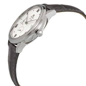 Stainless steel case with a silver grey (alligator) leather strap. Fixed stainless steel bezel. Silver dial with grey hands and alternating Roman numeral and cabochon hour markers. Minute markers around the outer rim. Dial Type: Analog. Date display at the 3 o'clock position. Two sub-dials displaying: small seconds and power reserve indicator. Omega calibre 2627 automatic movement, based upon Omega 2500, containing 29 Jewels, bitting at 25200 vph, and has a power reserve of approximately 48 hours. Scratch resistant sapphire crystal. Solid case back. Round case shape. Case size: 39 mm. Band width: 20 mm. Water resistant at 30 meters / 100 feet. Functions: date, hour, minute, small second, power reserve indicator, co-axial escapement, chronometer. Additional Info: original box, international warranty card, manual (complete accessories). De Ville Series. Luxury watch style. Watch label: Swiss Made. Omega De Ville Automatic Chronometer Silver Dial Men's Watch 424.13.40.21.02.005.