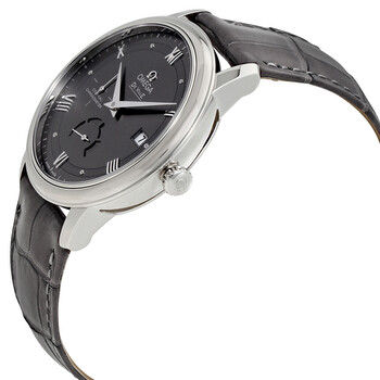 Stainless steel case with a grey leather strap. Fixed stainless steel bezel. Grey dial with silver-tone hands and alternating Roman numeral and dot hour markers. Minute markers around the outer rim. Dial Type: Analog. Date display at the 3 o'clock position. Omega calibre 2627 automatic movement with a 48-hour power reserve. Scratch resistant sapphire crystal. Pull / push crown. Solid case back. Case size: 39.5 mm. Round case shape. Tang clasp. Water resistant at 30 meters / 100 feet. Functions: date, hour, minute, second, power reserve. Luxury watch style. Watch label: Swiss Made. Omega De Ville Automatic Men's Watch 424.13.40.21.06.001.