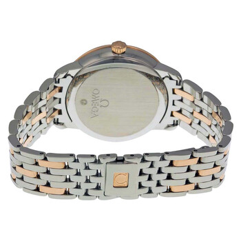 Silver-tone stainless steel case with a two-tone (silver-tone and rose gold-tone) stainless steel and 18kt rose gold bracelet. Fixed 18kt rose gold bezel. Mother of pearl dial with rose gold-tone dauphine-style shape hands and index hour markers. Roman numerals mark the 6, 9 and 12 o'clock positions. Dial Type: Analog. Date display at the 3 o'clock position. Omega Calibre 2500 Automatic movement, based upon ETA 2892-A2, containing 27 Jewels, bitting at 25200 vph, and has a power reserve of approximately 48 hours. Scratch resistant sapphire crystal. Pull / push crown. Solid case back. Round case shape, case size: 32.7 mm, case thickness: 9.5 mm. Deployment clasp. Water resistant at 30 meters / 100 feet. Functions: date, hour, minute, second, co-axial escapement, chronometer. Luxury watch style. Watch label: Swiss Made. Omega De Ville Automatic Mother of Pearl Dial Stainless Steel and 18kt Rose Gold Ladies Watch 42420332005002.