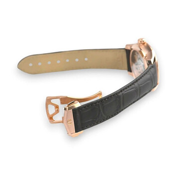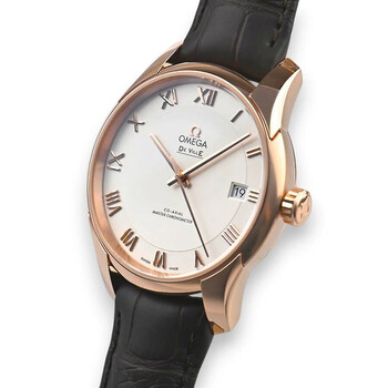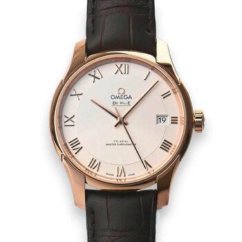 18kt rose gold case with a brown alligator/crocodile leather strap. Fixed 18kt rose gold bezel. Silver dial with rose gold hands and Roman numeral hour markers. Dial Type: Analog. Date display at the 3 o'clock position. Omega Calibre 8901 Automatic movement, based upon Omega 8900, containing 39 Jewels, bitting at 25200 vph, and has a power reserve of approximately 60 hours. Anti-reflective scratch resistant sapphire crystal. Pull / push crown. Transparent case back. Round case shape, case size: 41 mm. Push button deployant buckle clasp. Water resistant at 100 meters / 330 feet. Functions: date, hour, minute, second. De Ville Automatic Series. Luxury watch style. Watch label: Swiss Made. Omega De Ville Automatic Silver Dial Men's Watch 433.53.41.21.02.001.