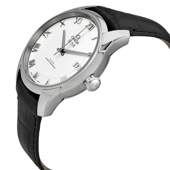 Stainless steel case with a black (alligator) leather strap. Fixed stainless steel bezel. Silver dial with silver-tone hands and Roman numeral hour markers. Dial Type: Analog. Date display at the 3 o'clock position. Omega calibre 8900 automatic movement, based upon Omega 8500, containing 39 Jewels, bitting at 25200 vph, and has a power reserve of approximately 60 hours. Scratch resistant sapphire crystal. Pull / push crown. Transparent case back. Round case shape. Case size: 41 mm. Band width: 20 mm. Deployment clasp. Water resistant at 100 meters / 330 feet. Functions: date, hour, minute, second. De Ville Series. Luxury watch style. Watch label: Swiss Made. Omega De Ville Automatic Silver Dial Men's Watch 433.13.41.21.02.001.