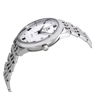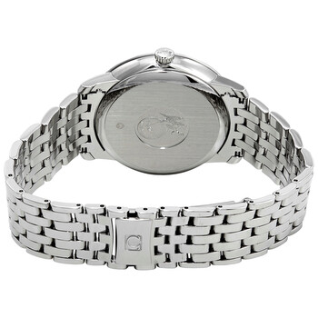 Stainless steel case with a stainless steel bracelet. Fixed stainless steel bezel. Silvery white dial with black dauphine-style hands and alternating Roman numeral and dot cabochon hour markers. Minute markers around the outer rim. Dial Type: Analog. Date display at the 3 o'clock position. Omega calibre 2500 automatic movement, based upon ETA 2892-A2, containing 27 Jewels, bitting at 25200 vph, and has a power reserve of approximately 48 hours. Scratch resistant sapphire crystal. Pull / push crown. Solid case back. Round case shape. Case size: 39.5 mm. Band width: 20 mm. Hidden fold over clasp. Water resistant at 30 meters / 100 feet. Functions: date, hour, minute, second, co-axial escapement, chronometer. De Ville Series. Luxury watch style. Watch label: Swiss Made. Omega De Ville Automatic Silvery White Dial Men's Watch 424.10.40.20.02.005.