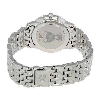 Stainless steel case with a stainless steel bracelet. Fixed stainless steel bezel. Blue dial with silver-tone hands and diamond hour markers. Roman numerals mark the 3, 6, 9 and 12 o'clock positions. Dial Type: Analog. Omega calibre 1376 quartz movement. Scratch resistant sapphire crystal. Pull / push crown. Solid case back. Case size: 27.4 mm. Round case shape. Bracelet width: 14 mm. Fold over clasp. Water resistant at 30 meters / 100 feet. Functions: hour, minute. Luxury watch style. Watch label: Swiss Made. Omega De Ville Ladies Watch 424.10.27.60.53.003.