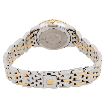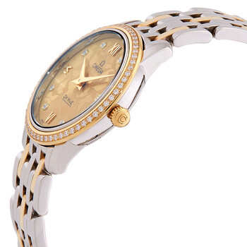 Stainless steel case with a stainless steel bracelet with 18kt yellow gold links. Fixed 18kt yellow gold bezel set with diamonds. Champagne butterfly dial with gold-tone hands and diamond hour markers. Roman numerals mark the 3, 6, 9 and 12 o'clock positions. Dial Type: Analog. Omega calibre 1376 quartz movement. Scratch resistant sapphire crystal. Pull / push crown. Solid case back. Round case shape. Case size: 27.4 mm. Band width: 14 mm. Fold over clasp. Water resistant at 30 meters / 100 feet. Functions: hour, minute. De Ville Prestige Series. Luxury watch style. Watch label: Swiss Made. Omega De Ville Champagne Butterfly Diamond Dial Ladies Watch 424.25.27.60.58.002.