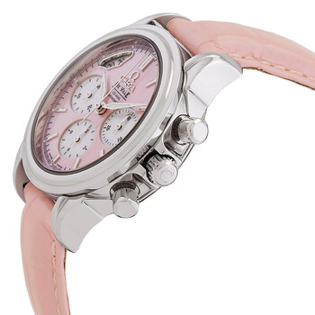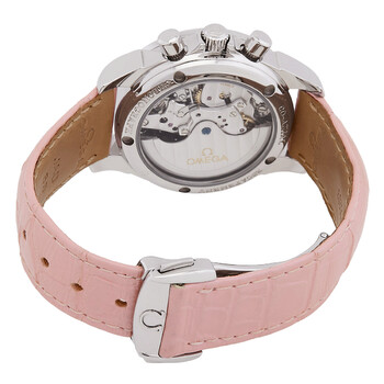 Silver-tone stainless steel case with a pink leather strap. Fixed silver-tone bezel. Mother of pearl pink dial with silver-tone hands and index hour markers. Dial Type: Analog. Chronograph - three sub-dials displaying: 12 hours, 30 minutes, 60 seconds. Omega Calibre 3313 Automatic movement, based upon Piguet 1285, containing 37 Jewels, bitting at 28800 vph, and has a power reserve of approximately 52 hours. Scratch resistant sapphire crystal. Transparent see through case back. Round case shape, case size: 35 mm, case thickness: 13 mm. Buckle clasp. Water resistant at 100 meters / 330 feet. Functions: chronograph, date, hour, minute, second. De Ville Series. Watch label: Swiss Made. Omega De Ville Chronograph Automatic Ladies Watch 48787434.