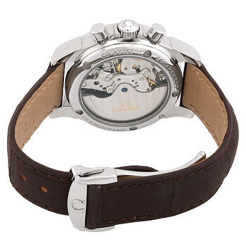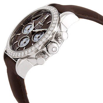 Stainless steel case with a brown alligator leather strap. Fixed diamond set bezel. Brown dial with silver-tone hands and index hour markers. Minute markers around the outer rim. Dial Type: Analog. Luminescent hands and markers. Date display at the 11 o'clock position. Chronograph - three sub-dials displaying: 12 hours, 60 seconds and 30 minutes. Omega Calibre 3313 automatic movement with a 52-hour power reserve. Scratch resistant sapphire crystal. Case size: 35 mm. Round case shape. Water resistant at 100 meters / 330 feet. Functions: chronograph, date, hour, minute, second, co-axial escapement, chronometer. Luxury watch style. Watch label: Swiss Made. Omega De Ville Chronograph Automatic Ladies Watch 422.18.35.50.13.001.