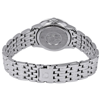 Stainless steel case with a stainless steel bracelet. Fixed stainless steel bezel. Grey dial with blue hands and alternating diamond and Roman numeral hour markers. Minute markers around the outer rim. Dial Type: Analog. Omega calibre 1376 quartz movement. Scratch resistant sapphire crystal. Pull / push crown. Solid case back. Round case shape. Case size: 27.4 mm. Band width: 14 mm. Deployment clasp. Water resistant at 30 meters / 100 feet. Functions: hour, minute. Additional Info: set of 6 diamonds on dial. Dress watch style. Watch label: Swiss Made. Omega De Ville Diamond Grey Dial Ladies Watch 424.10.27.60.56.002.