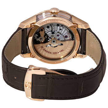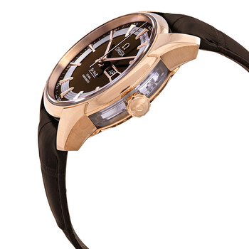 18kt rose gold case with a brown (alligator) leather strap. Fixed 18kt rose gold bezel. Brown dial with luminous rose gold-tone hands and index hour markers. Minute markers around the outer rim. Dial Type: Analog. Luminescent hands and markers. Month and date display at the 3 o'clock position. Omega calibre 8611 automatic movement, based upon Omega 8601, containing 39 Jewels, bitting at 25200 vph, and has a power reserve of approximately 60 hours. Scratch resistant sapphire crystal. Pull / push crown. Transparent case back. Round case shape. Case size: 41 mm. Band width: 20 mm. Push button fold over clasp. Water resistant at 100 meters / 330 feet. Functions: annual calendar, month, date, hour, minute, second, co-axial escapement, chronometer. Luxury watch style. Watch label: Swiss Made. Item Variations: 431 63 41 22 13 001, 431-63-41-22-13-001, 431/63/41/22/13/001, 43163412213001. Omega De Ville Hour Vision 18kt Rose Gold Automatic Chronometer Men's Watch 431.63.41.22.13.001.